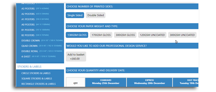 Once you have selected your product, You now need to choose your printing options which will vary depending on the product you have chosen. You will see we offer single or double sides, various paper types and materials, and extra finishing such as folding or laminating etc..You also have an option here to add our professional design service to your order if you do not have a file ready to print from.