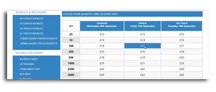 Express or Fast track all with different delivery dates, Simply click the price for the quantity for whichever delivery date suits you best, to add to the shopping basket. Also bear in mind these turnarounds do not take into account Bank Holidays when we will be closed.
