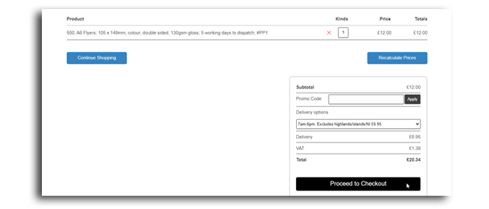 In the shopping basket it’s pretty much the same as most ecommerce stores, check your order is correct and you are happy with the price, then select your delivery option; On most products we offer a FREE option, along with a range of different premium services to suit your needs. Now click the 'Proceed to Checkout' button when you are ready to proceed with your order.