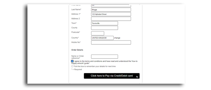 When you have completed your details, you will need to enter the name of your file (i.e. Bill Bloggs A5 Leaflet) and agree to our terms and conditions.